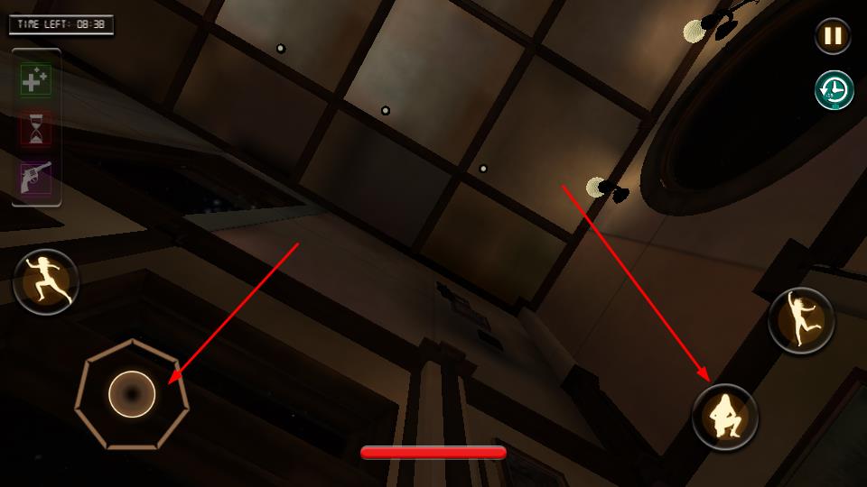 2、左侧八角形虚拟摇杆操控角色移动,右侧按键分别实现蹲伏、跳跃等动作,左上角关注TIME LEFT时间,左侧栏切换医疗、沙漏、手枪等道具,辅助探索。