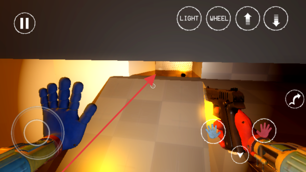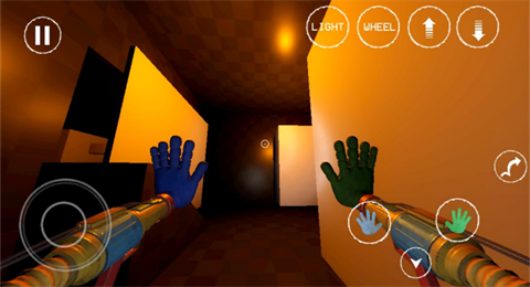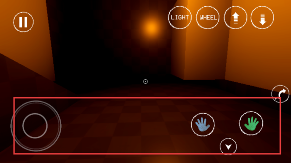 1、进入游戏,利用左下角摇杆、右侧手掌按钮蓝、绿等控制角色,结合上方LIGHT、WHEEL等功能键,探索昏暗场景。