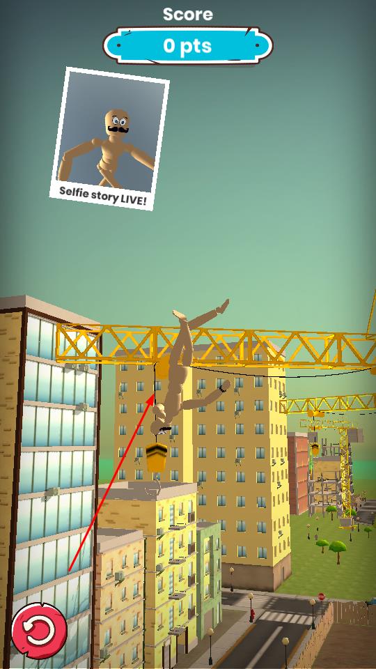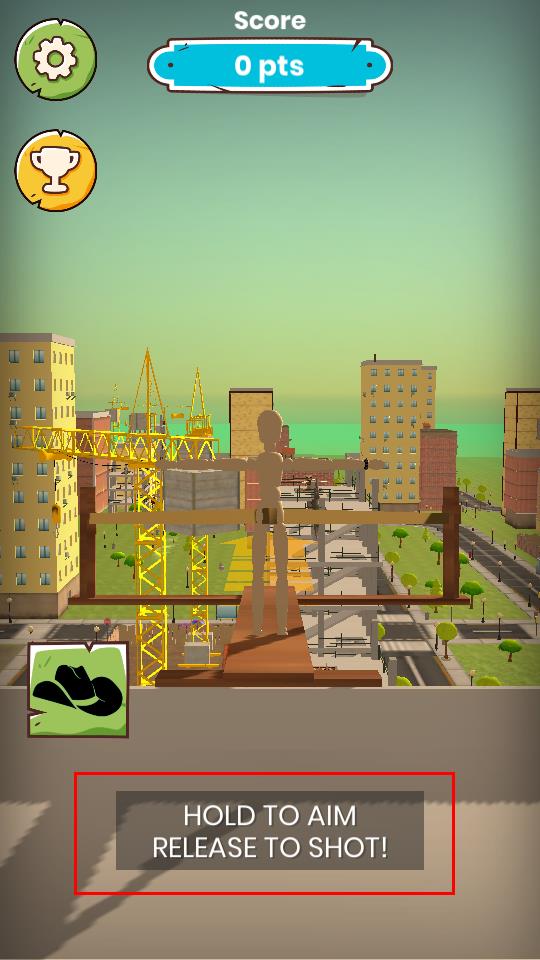 1、在建筑场景中依据HOLD TO AIM RELEASE TO SHOT!提示,按住屏幕瞄准,规划木偶弹射轨迹,为弹射操作做准备。