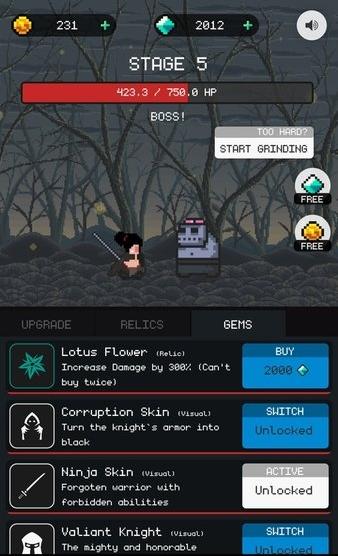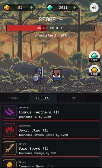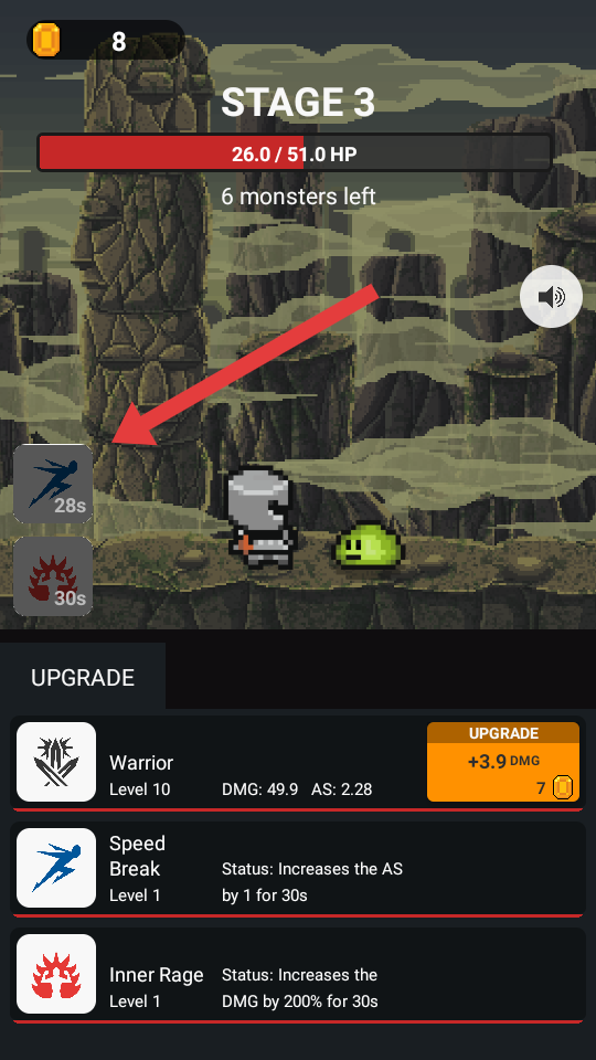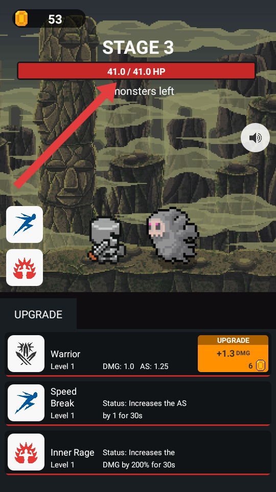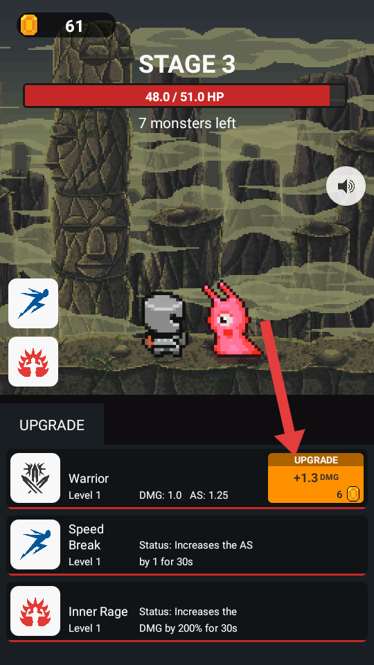 2、积累一定的金币后,可以点击Warrior栏右侧UPGRADE+1.3DMG按钮,消耗6金币提升伤害,强化角色输出能力。