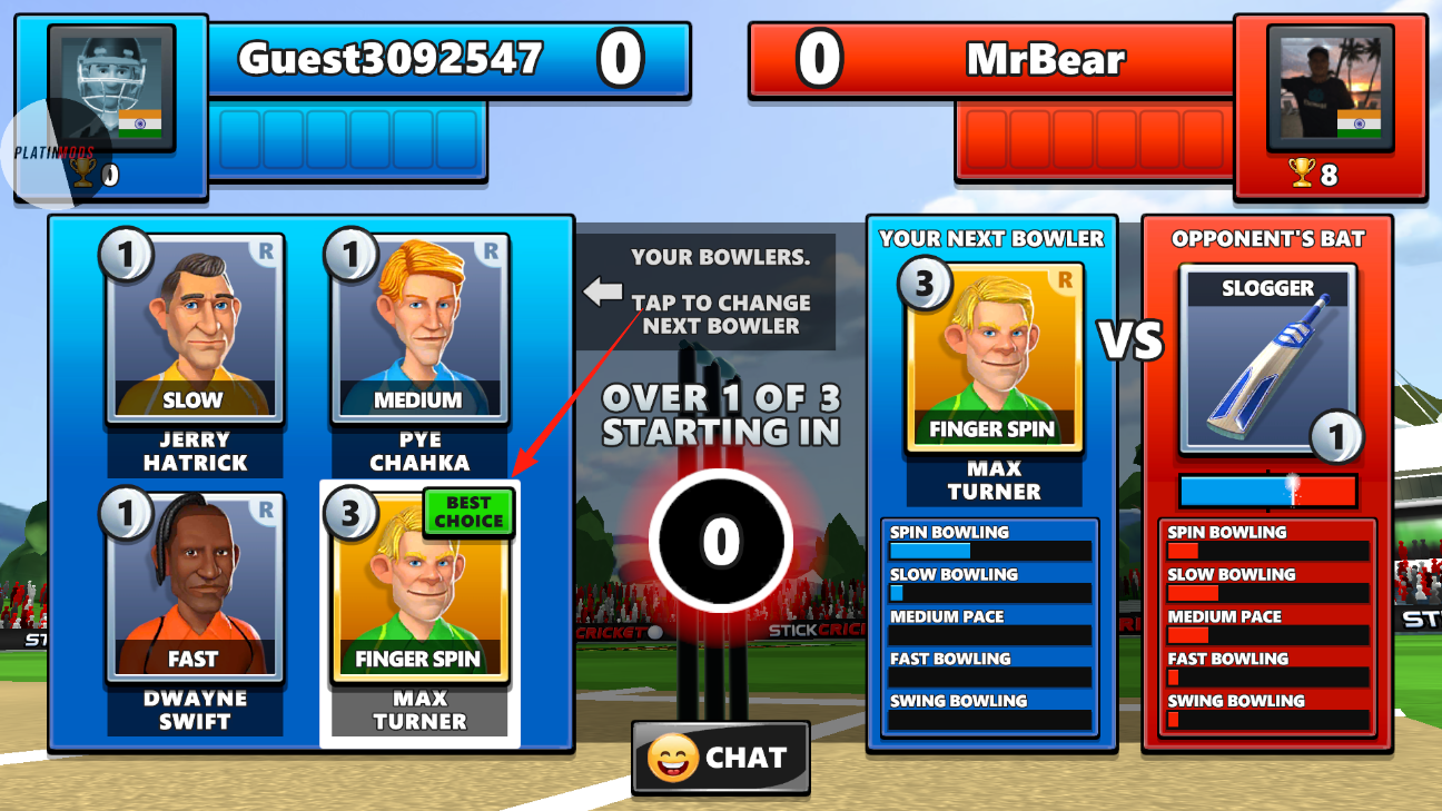 2、进入选投球手的界面啦,能看到自己的投球手们,还可以切换下一个投球手,选个合适的投球手,然后准备好等比赛开始,和对手MrBear展开投球对决,看看谁的投球更厉害。