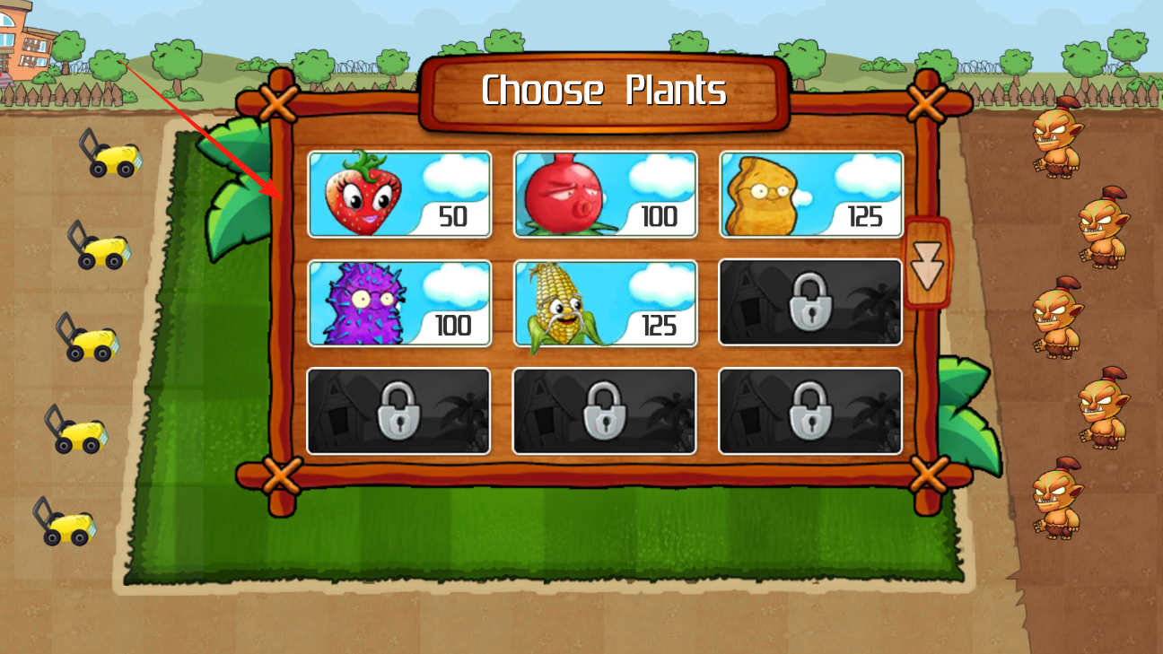 1、进入选植物界面,能看到草莓石榴这些植物,每个都标了价格,选喜欢的植物,比如草莓,点它,然后把它放到左边的草地格子里,准备用这些植物来防御敌人。