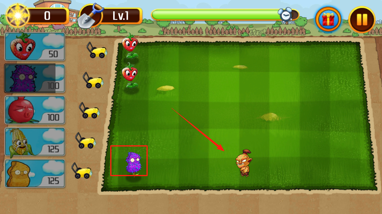2、选好草莓后,把它种到草地的格子里,种下去后,草莓会慢慢生长,等它成熟,就能用来攻击从右边过来的敌人,保护自己的地盘。