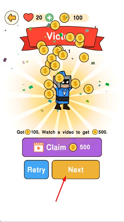 3、成功击败敌人,获取金币奖励,点击Next进入下一关。