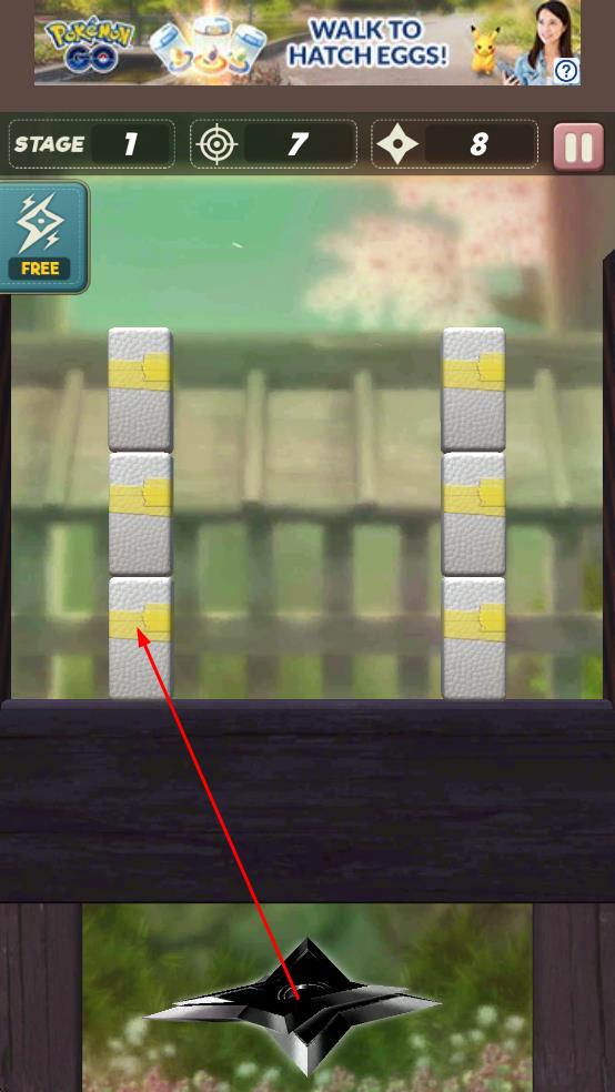 1、点击底部黑色手里剑,瞄准上方方块投掷,破坏障碍。