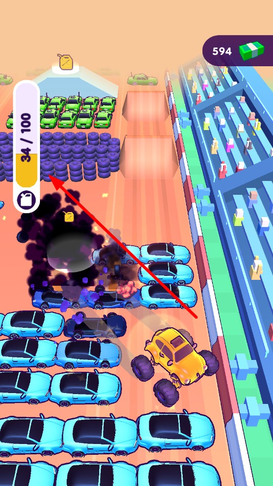 1、进入游戏,操控巨型车在障碍赛道行驶,长按屏幕加速,压碎车辆,观察燃油条,归零后,车辆前进速度变慢。