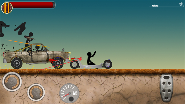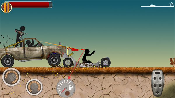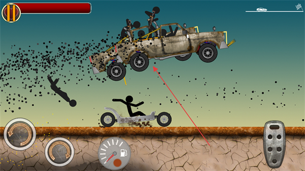 1、进入游戏,通过屏幕左侧圆形按钮控制火柴人车辆的前进、后退与转向,留意上方红色血条。