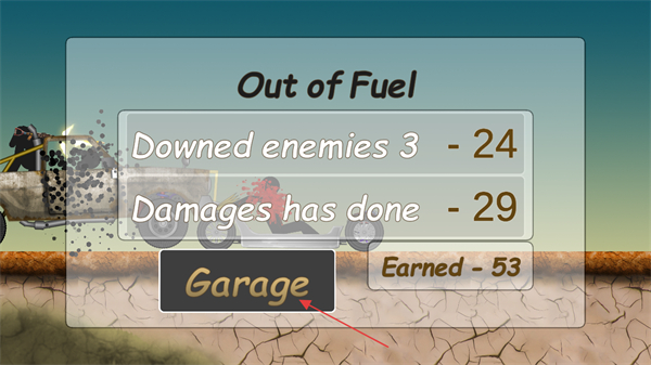 4、游戏结束出现OutofFuel界面后,查看击败敌人数量、造成伤害等数据,点击Garage进入车库进行车辆等方面的调整。
