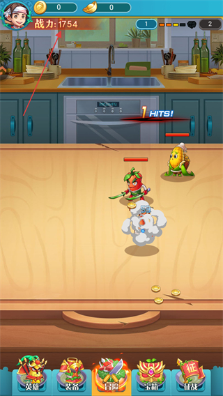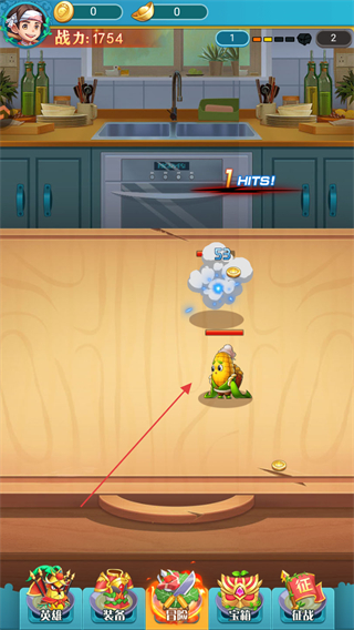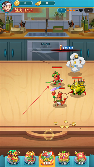 4、击败敌方精灵获取金币和道具,不断提升英雄战力,点击下方“英雄”“装备”等按钮进行强化。