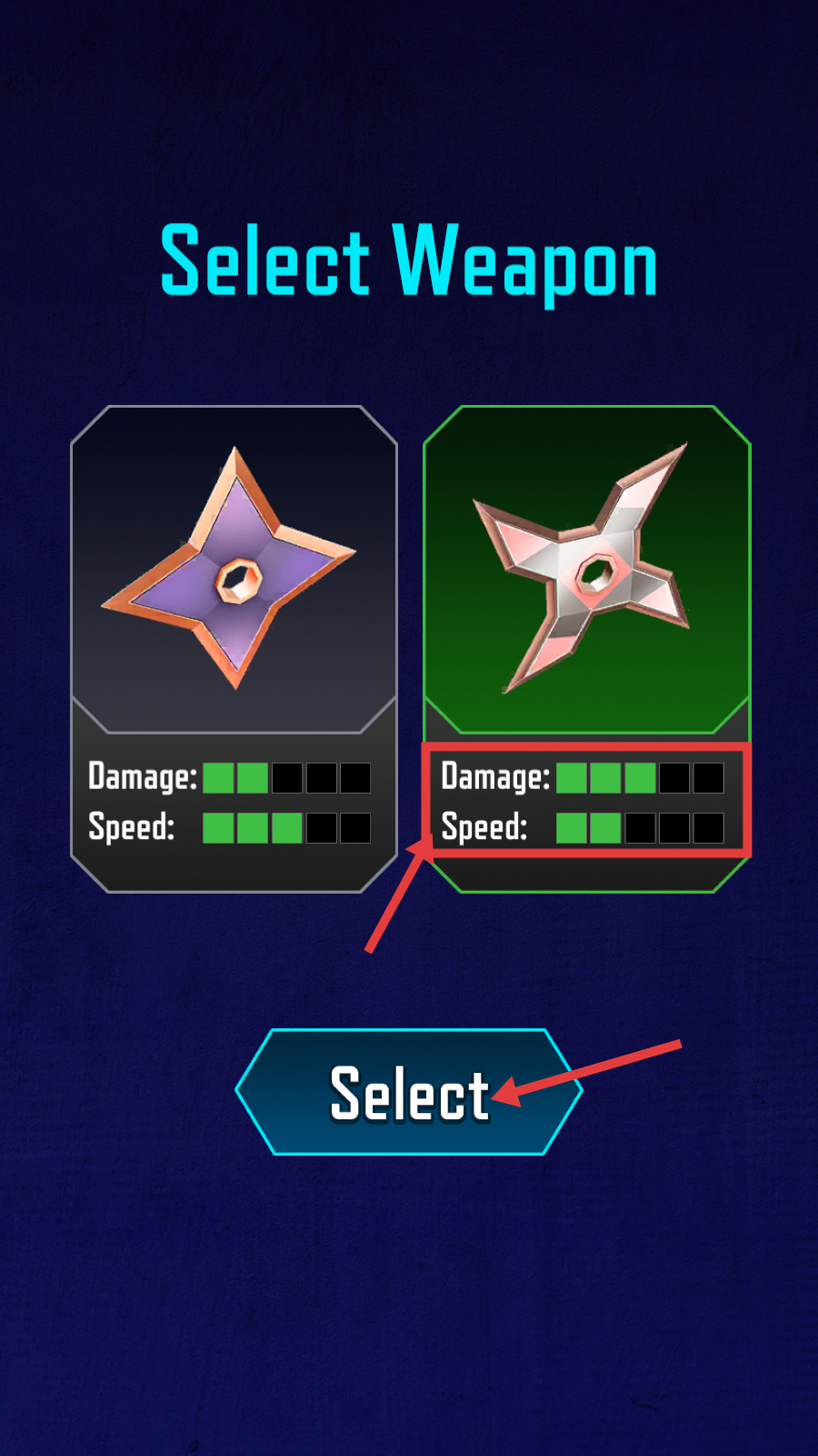 1、在【Select-Weapon】界面,对比两种飞镖的【Damage】和【Speed】属性,选好后点击【Select】确定武器。