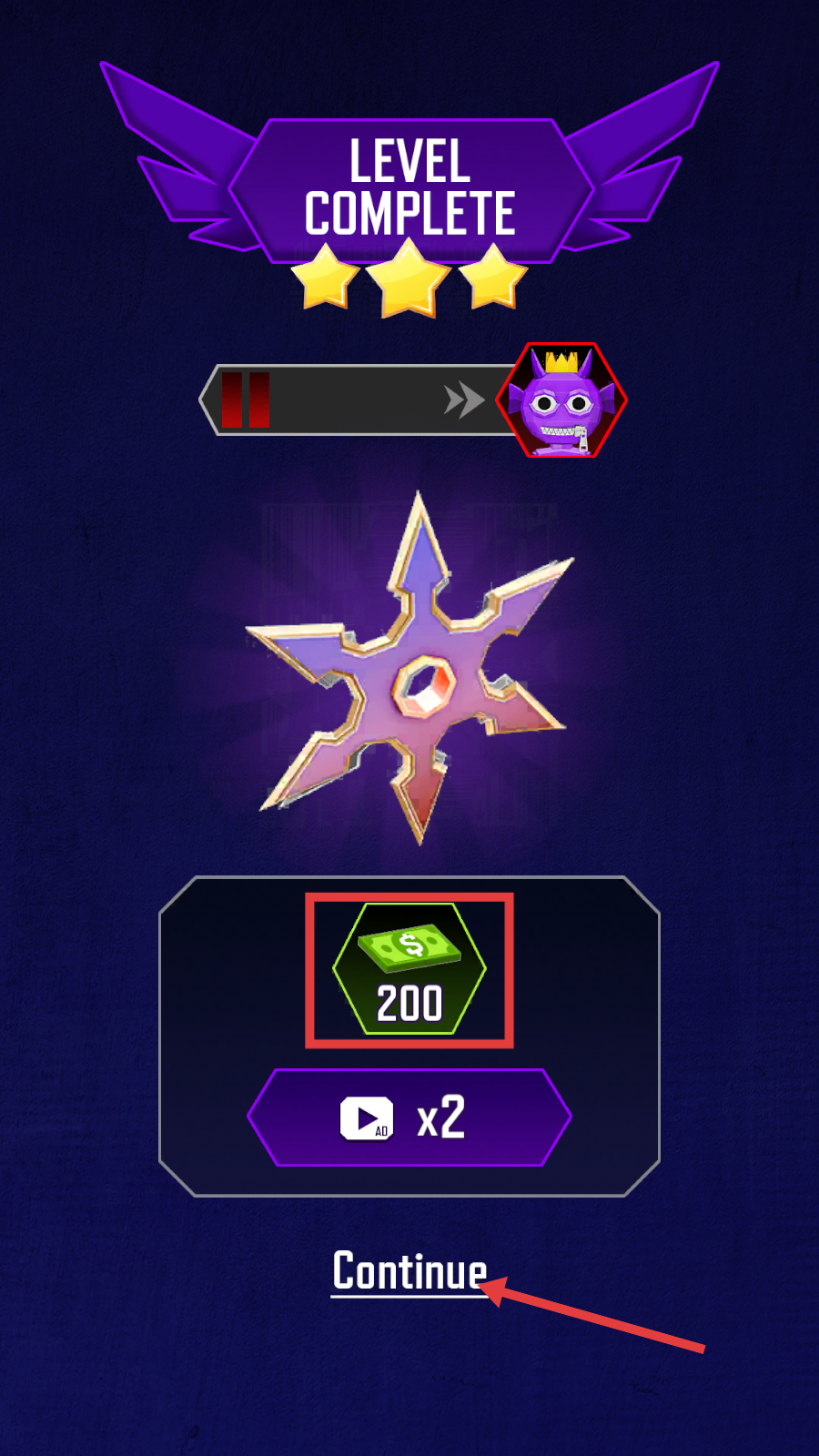 4、关卡完成后,界面显示【LEVEL-COMPLETE】,获取【200】货币奖励,点击【Continue】继续挑战下一关。