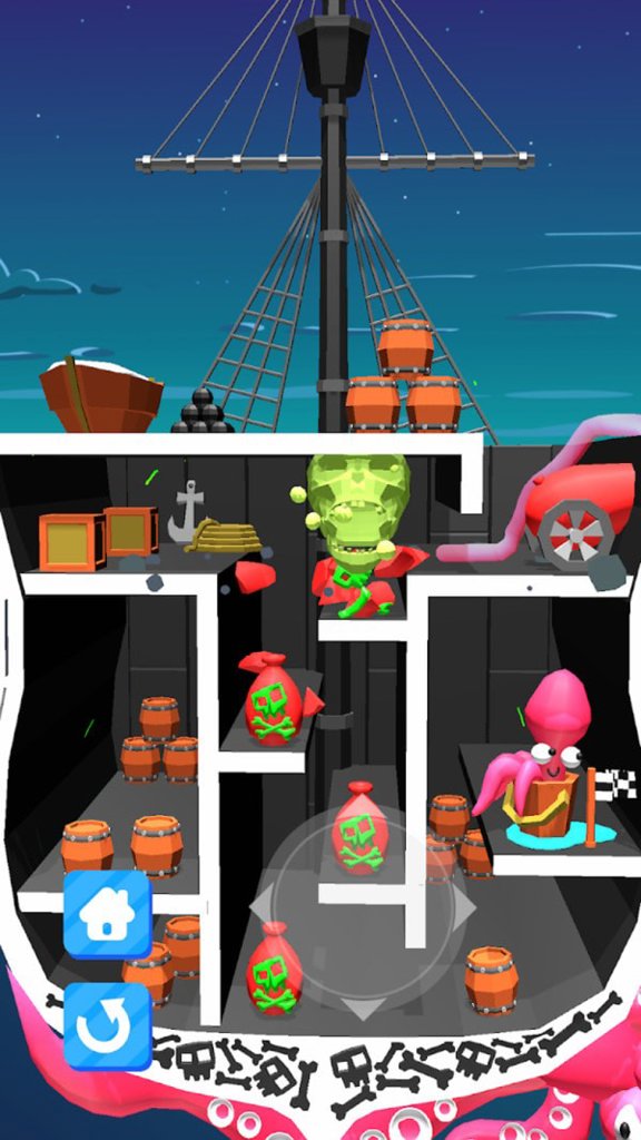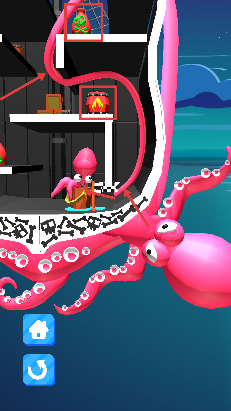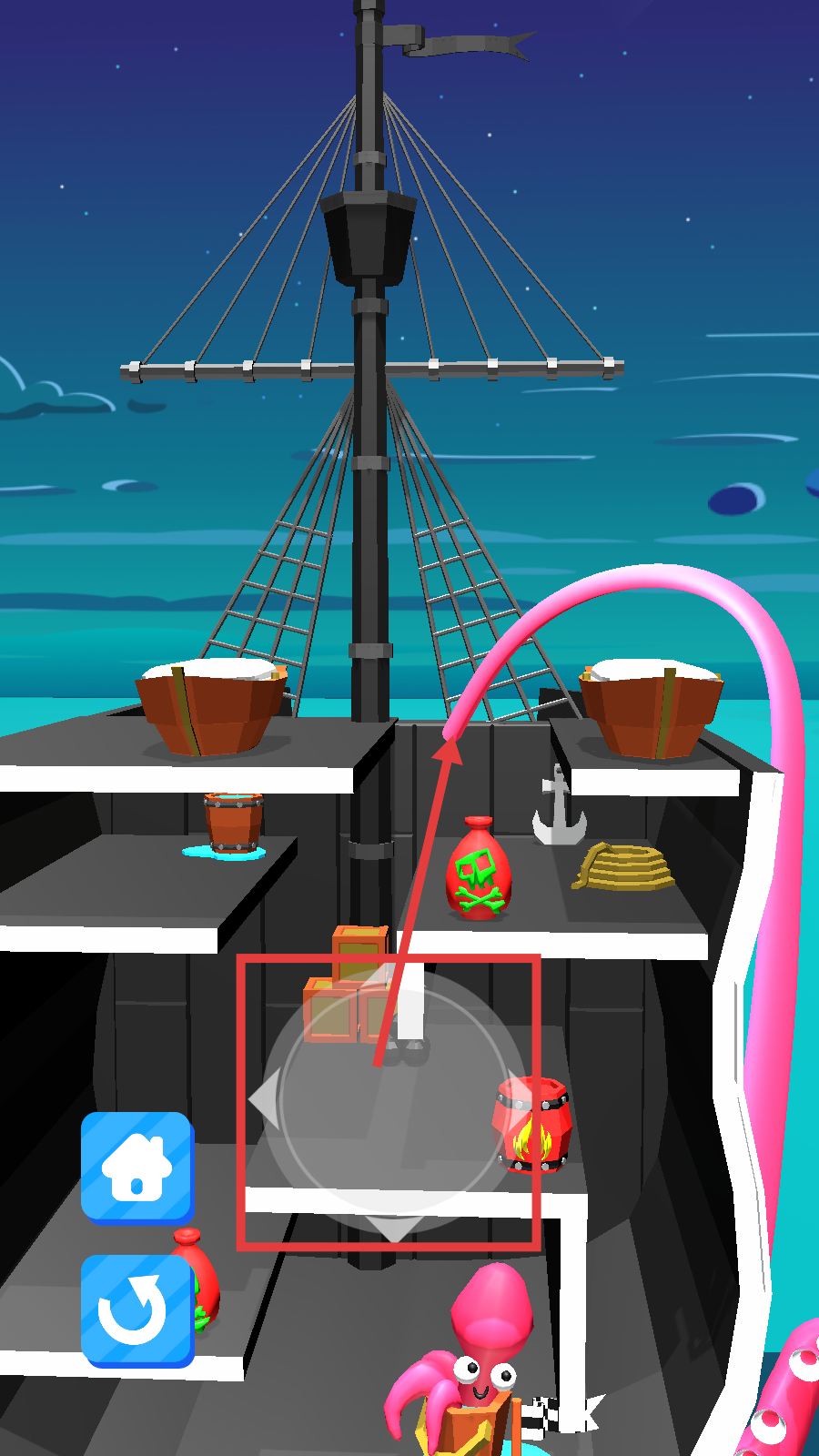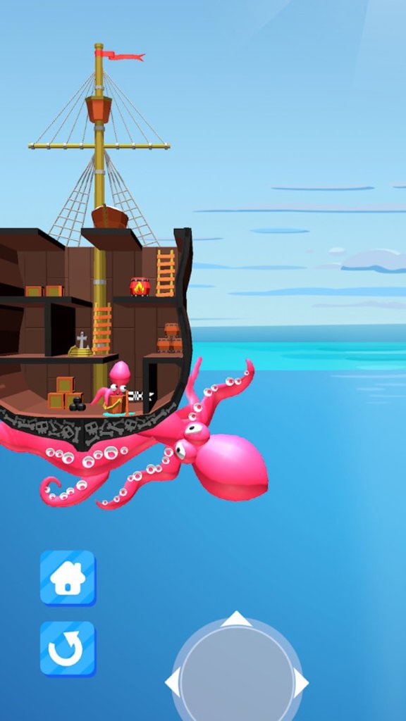 2、进入游戏场景后,操控粉色章鱼的触手,借助屏幕中的操控区域,朝着船上的目标物品方向移动。
