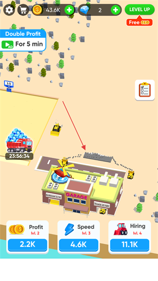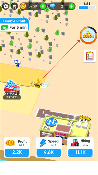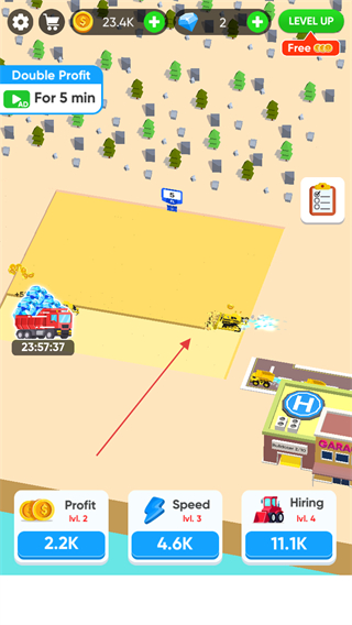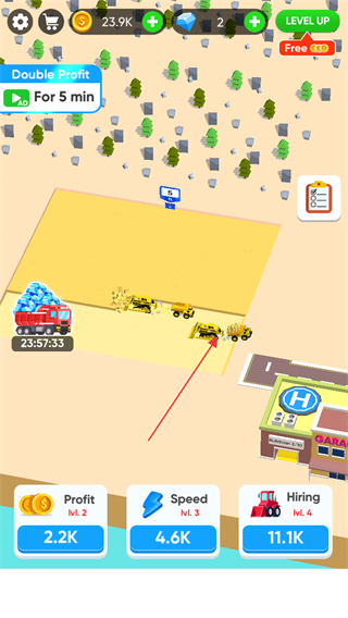 2、点击下方Hiring按钮,花费金币雇佣更多推土机,提升挖掘效率。