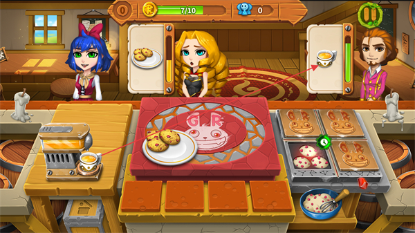 2、根据左侧顾客需求,将烤好的饼干装盘,满足其需求获取金币,使金币数量增加如$7。