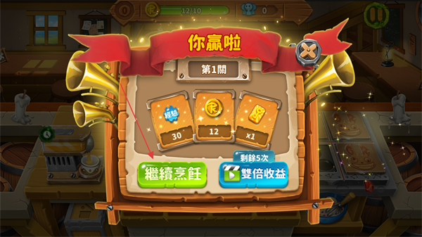 4、完成本关所有顾客订单,出现你赢啦提示,领取经验值,金币等奖励,点击继续烹饪进入下一关。