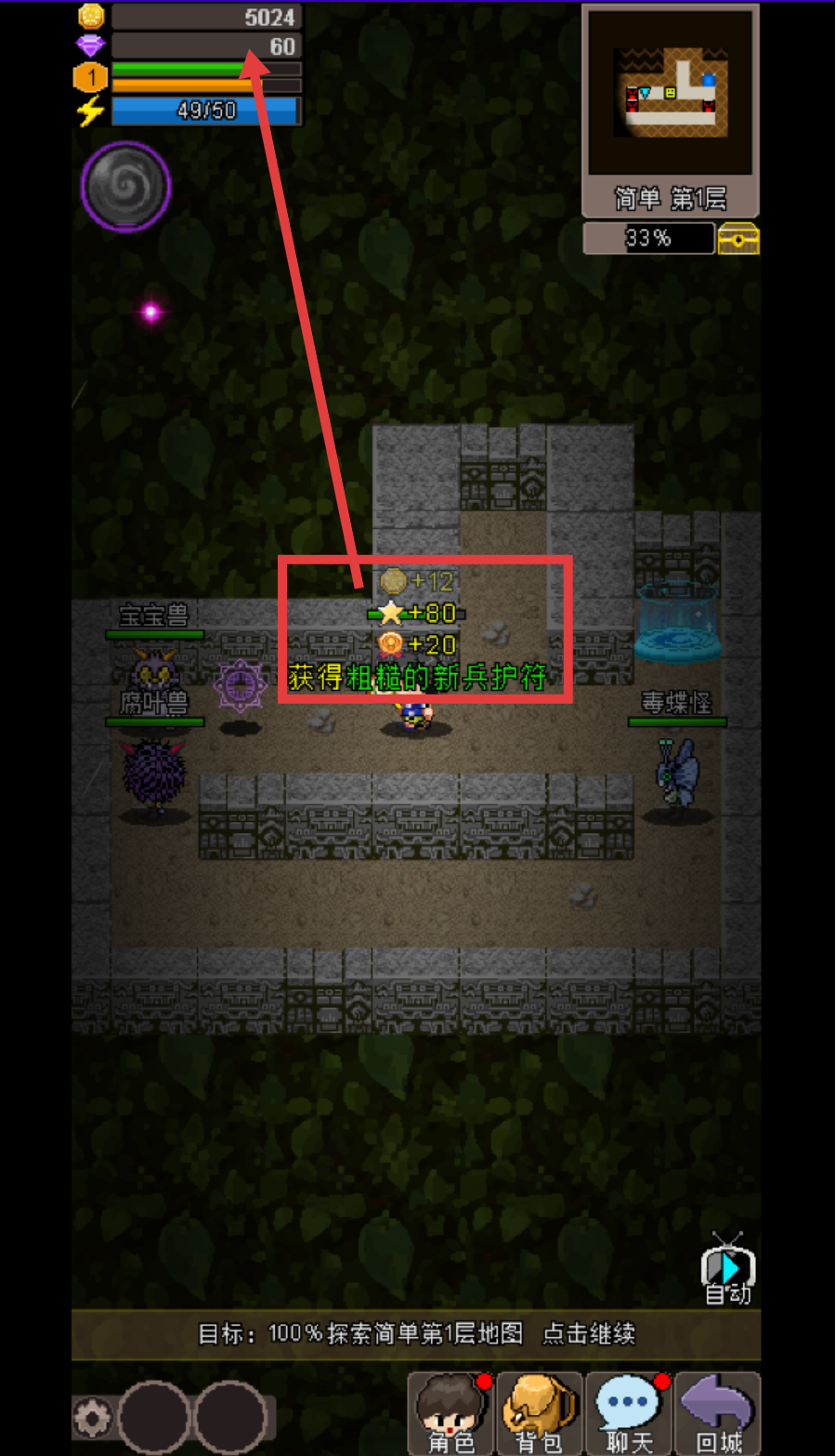 3、击败怪物后,可获取【金币+12】【经验+80】等奖励,还有概率得到【粗糙的新兵护符】,积累初期资源。