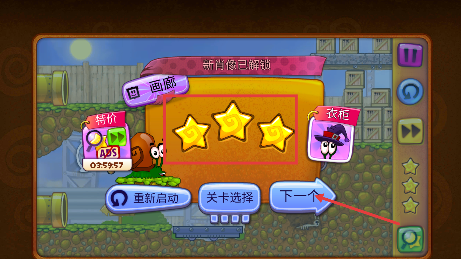 4、通关后若达成【三星评价】,可解锁新【蜗牛肖像】,解锁的肖像可在主界面更换,同时记录当前关卡进度。