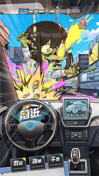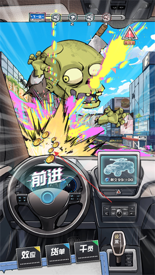 3、当僵尸靠近,点击屏幕发射攻击,击退僵尸,保证车辆继续前进。