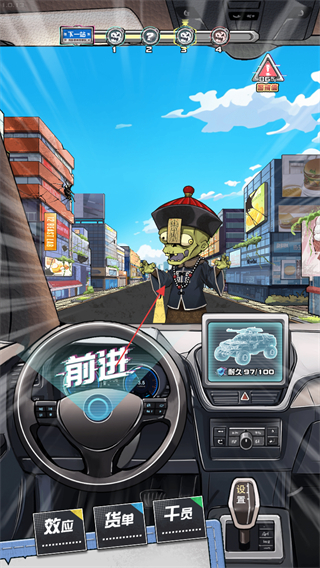 2、行驶过程中,留意前方出现的僵尸如清朝官服僵尸,准备应对。