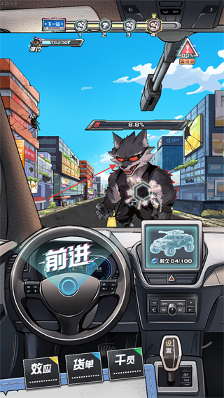 1、进入游戏,点击前进按钮,驾驶车辆在末日城市道路上行驶。