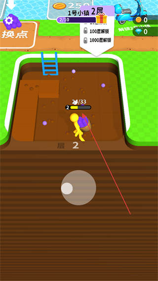 1、操控角色在地下挖掘,收集地下的紫色球体等资源,提升收集数量2/33。