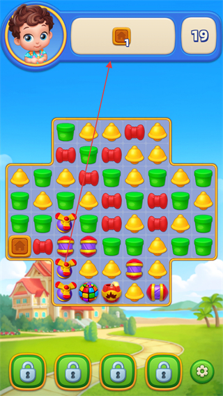 2、观察消除界面,通过移动道具位置,使三个或三个以上相同道具连成一线,触发消除效果。