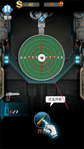 2、进入靶场后,看到屏幕中间的靶子,点击开火按钮开枪射击。