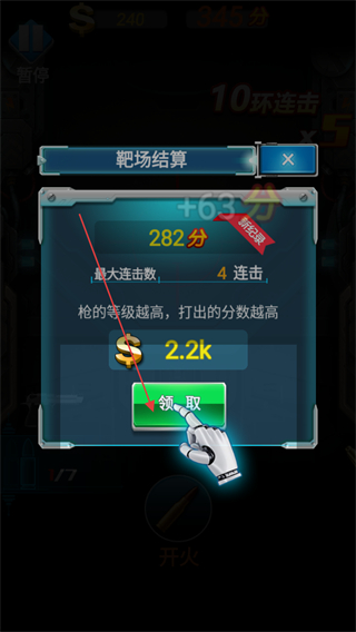 4、射击结束,查看靶场结算分数,点击领取按钮获取游戏奖励。