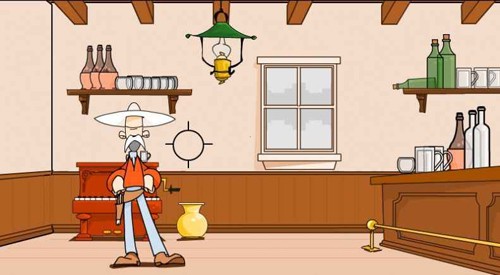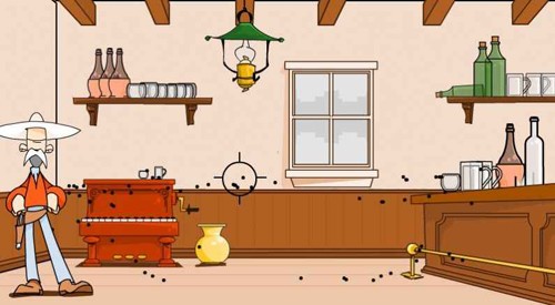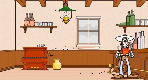 2、在酒吧场景中,瞄准牛仔周围的目标射击,利用点击操作精准命中,推进射击任务的进程。