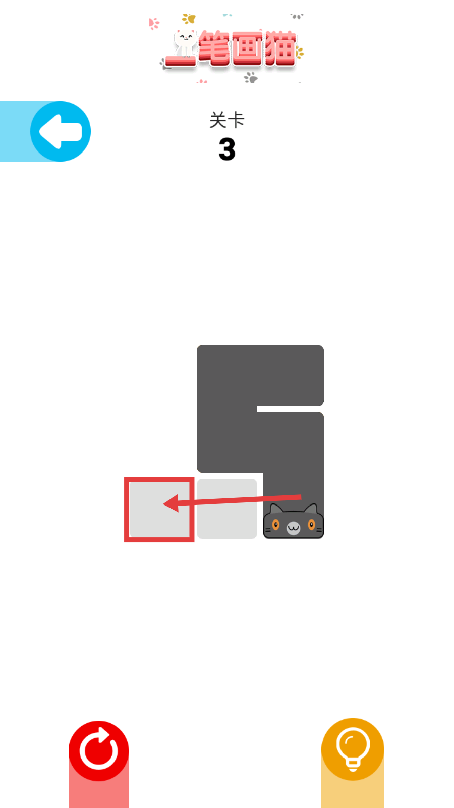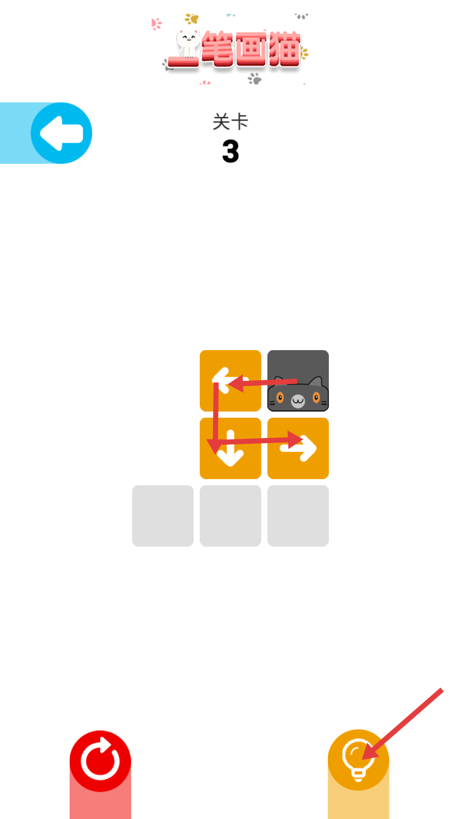 3、在【关卡-3】里,按照箭头方向操控,让猫沿路径移动,完成笔画解谜的关键操作。