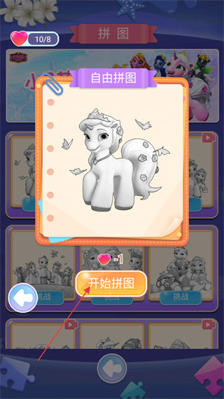 1、进入拼图界面,查看左上角爱心数量10/8,选择自由拼图,点击开始拼图按钮。