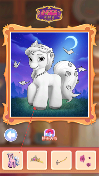 2、按照轮廓和图案提示,在空白拼图区域拼接小马图案,完成基础拼图。