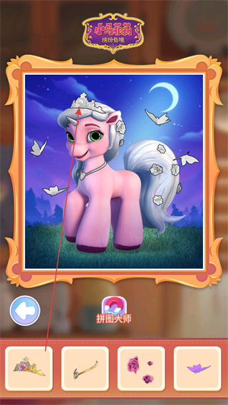 3、下方会出现小马的装饰道具,点击道具放置到对应位置,比如将皇冠放到小马头上。