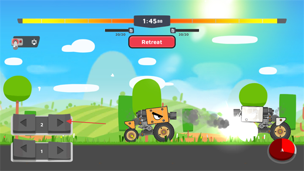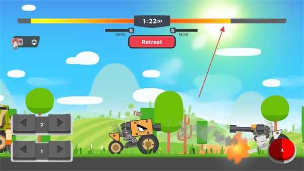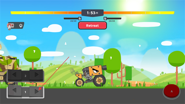 1、进入游戏,查看屏幕上方的倒计时如1:53:11和双方战车的生命值如20/20,点击屏幕左侧的按钮切换武器。