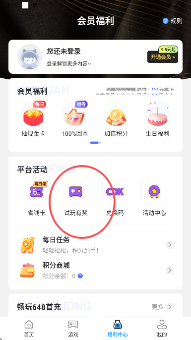 1、这里小编给大家推荐一个方法,进入到福利中心,点击试玩有奖