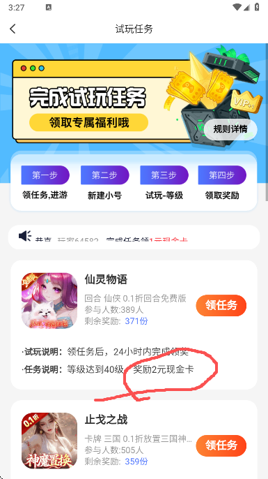 2、然后就可以领取试玩任务了,可以领到几元现金哦
