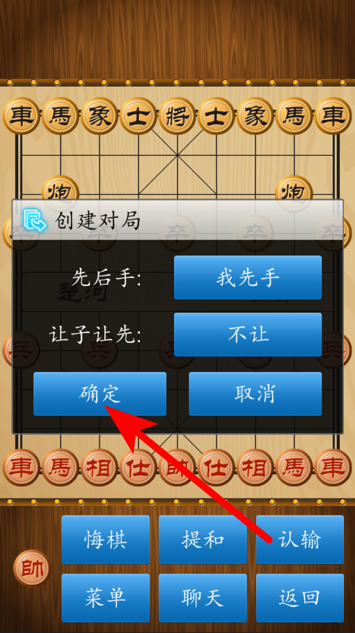 4、在创建对局设置界面,设置先后手、让子让先等内容后,点击确定按钮,即可完成联机创建对局操作。