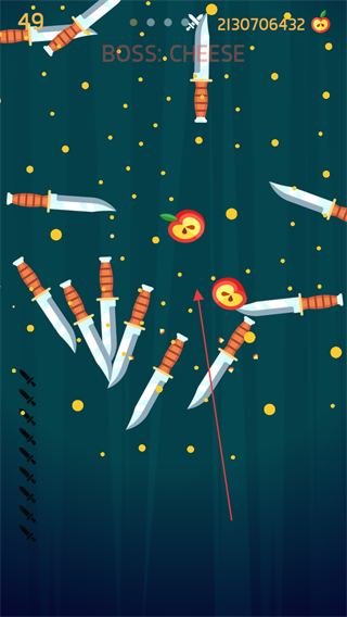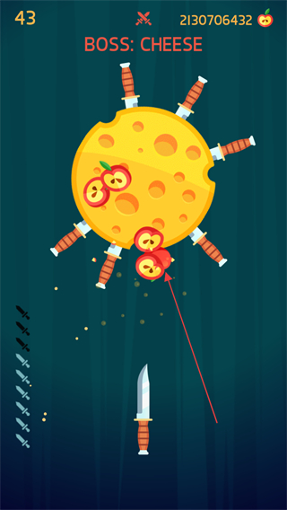 1、进入关卡看到BOSS:CHEESE,瞄准奶酪BOSS发射飞刀,同时避开苹果与已插飞刀。