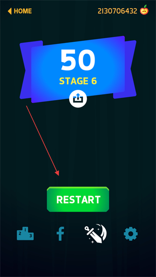 4、来到关卡结算界面,显示STAGE6,点击RESTART按钮可重新挑战关卡。