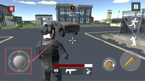 2、如何移动角色:在游戏内,使用左下角的虚拟摇杆控制角色移动,寻找敌人。
