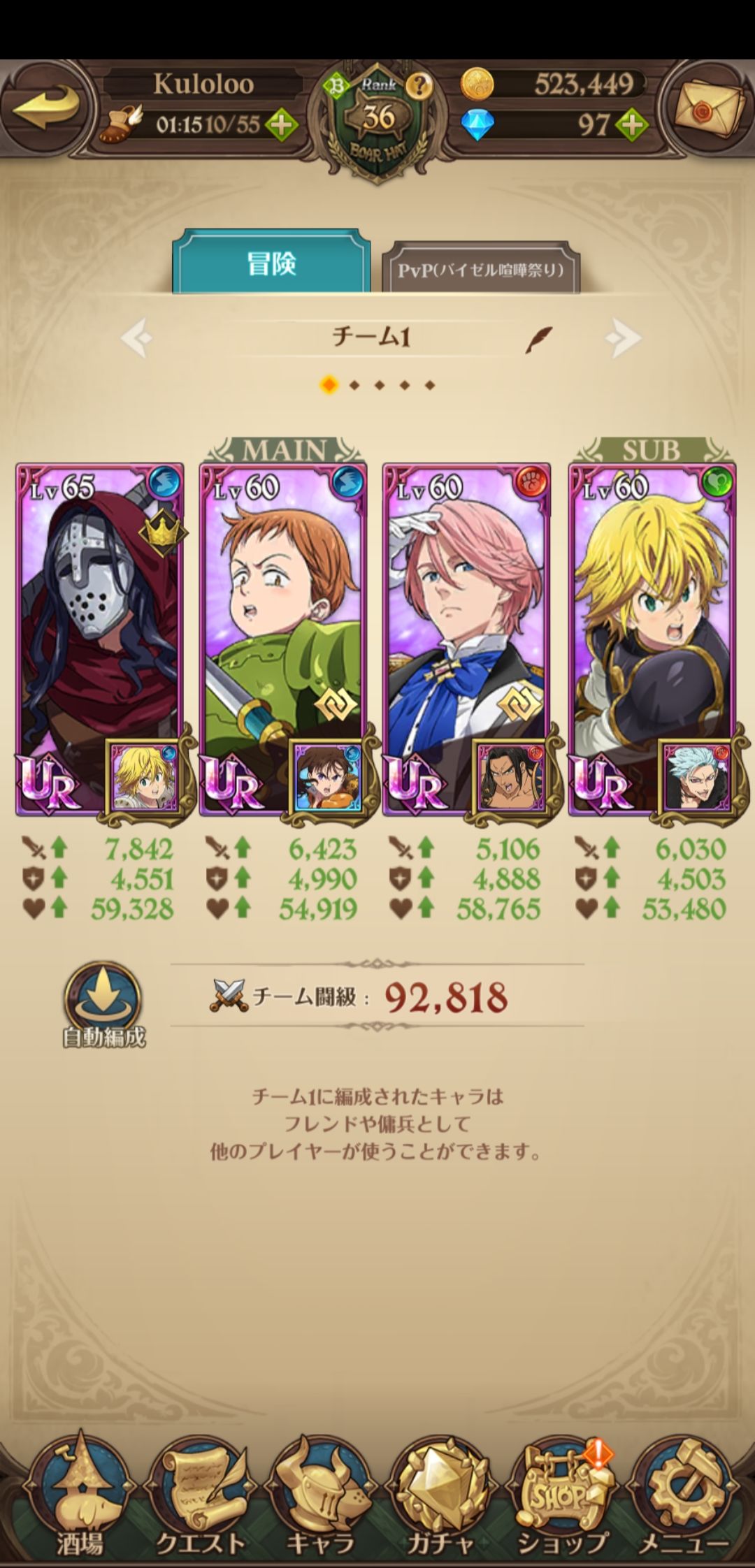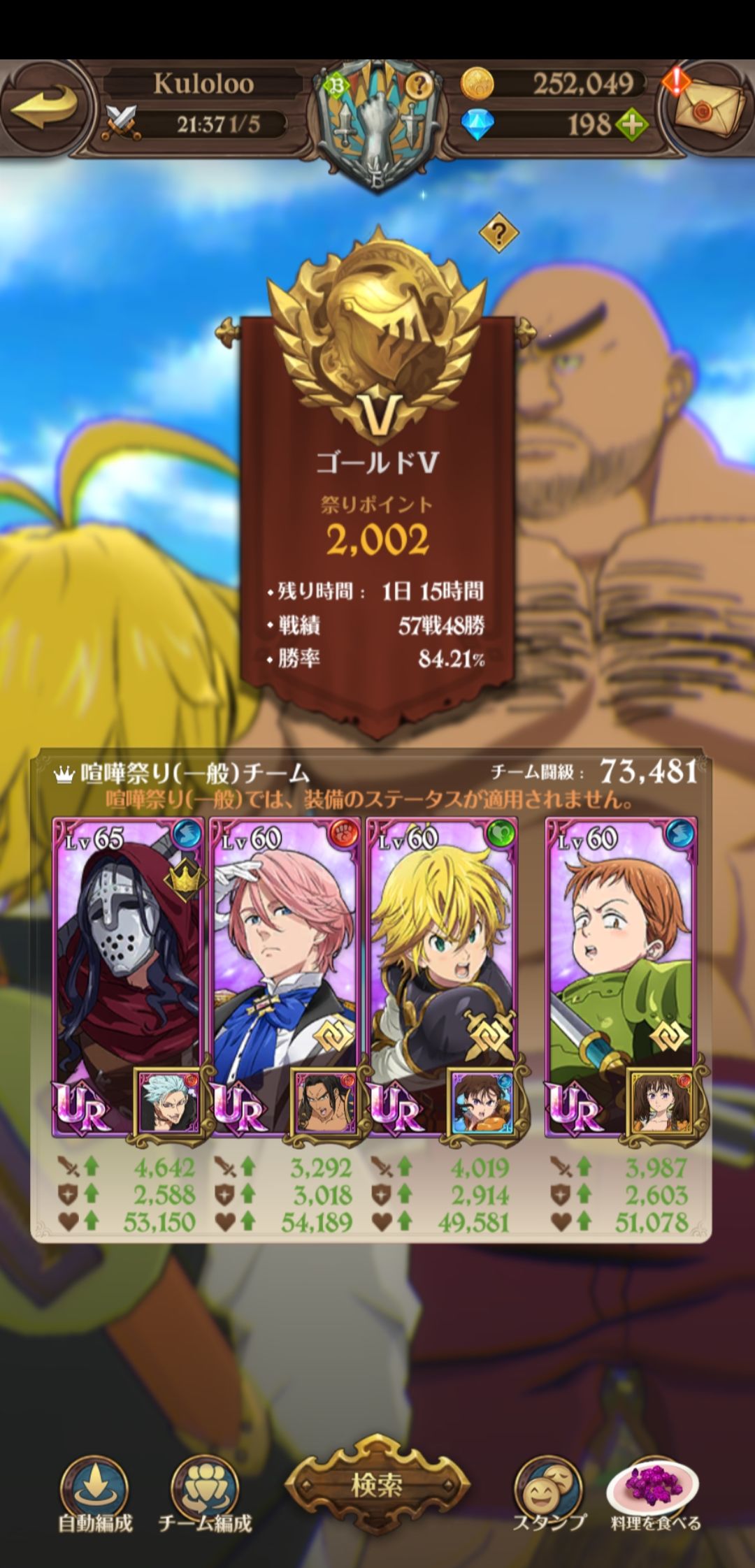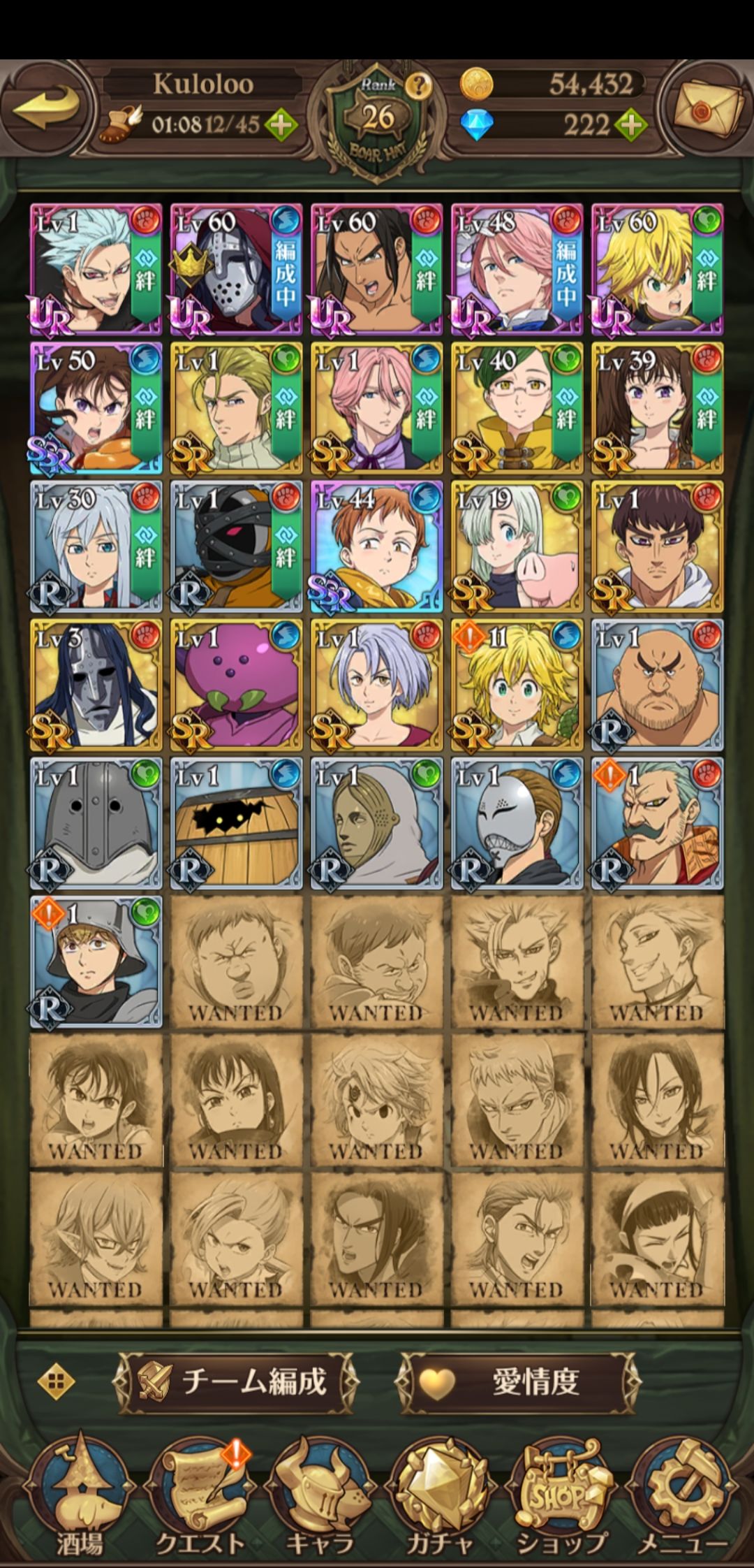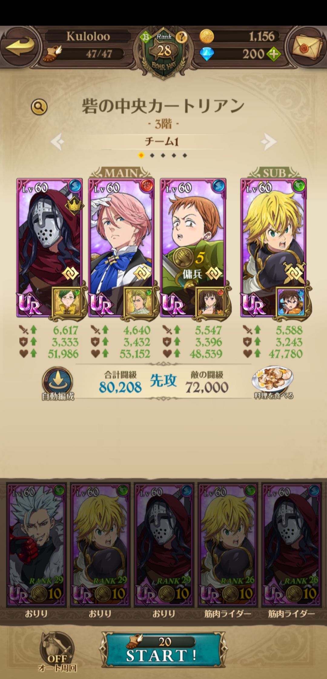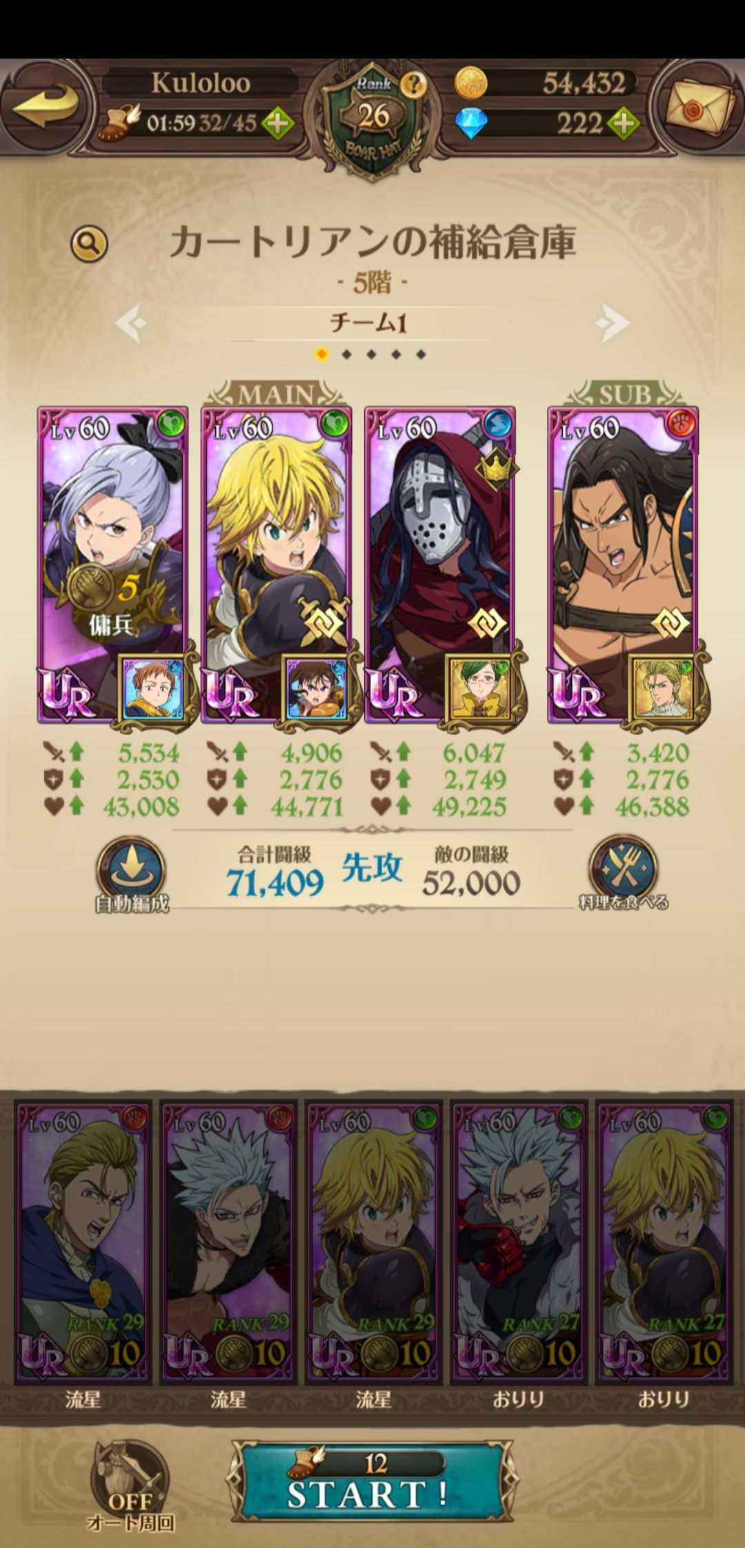 下面是我的角色其中4角色都是4星觉醒,满ssr装备,其中3个满衣装,面具,金,团长,还差雷帝