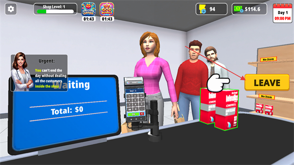 4、完成找零后,点击LEAVE让顾客离开,同时关注左上角ShopLevel等级,通过完成交易提升店铺等级和收益。