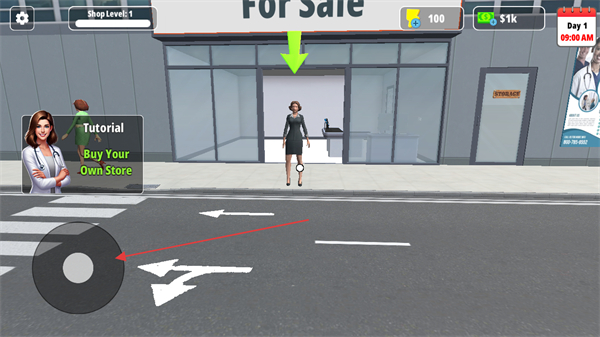 1、游戏初始,通过左侧虚拟摇杆操控角色移动,前往标有ForSale的药房。