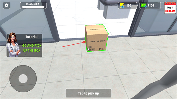 2、进入药房后,靠近地上的箱子,根据提示点击屏幕拾取箱子。