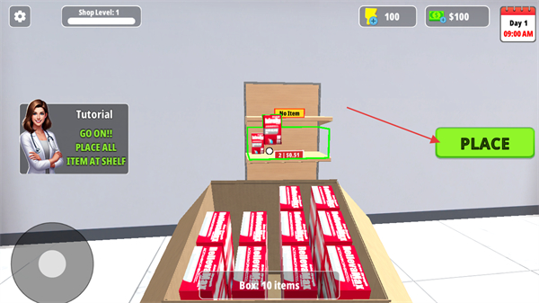 4、将箱子里的物品放置到指定的货架上,点击PLACE按钮完成放置,逐步完成药房的前期布置。