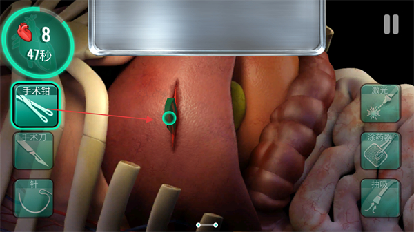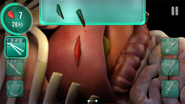1、进入手术场景,留意屏幕左上角剩余时间和患者生命值,点击左侧手术钳,取出伤口处异物。