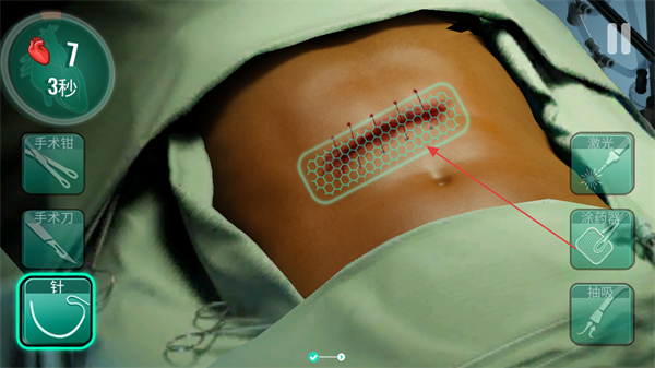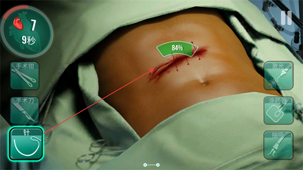 3、使用针工具对伤口进行缝合,关注缝合进度条,尽量快速精准操作。