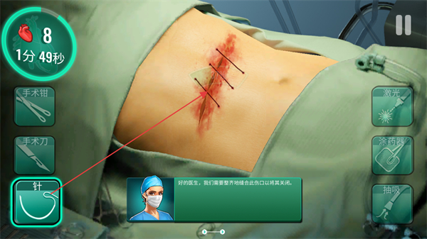 2、进入手术界面,点击左侧的针工具,按照提示逐步缝合伤口。