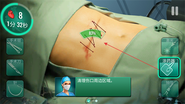 3、缝合完成后,点击右侧的涂药器,清理伤口周边区域,留意进度提示。