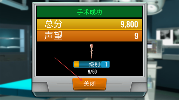 4、完成手术操作,若显示手术成功,查看总分和声望等信息,点击关闭进入下一个手术任务。